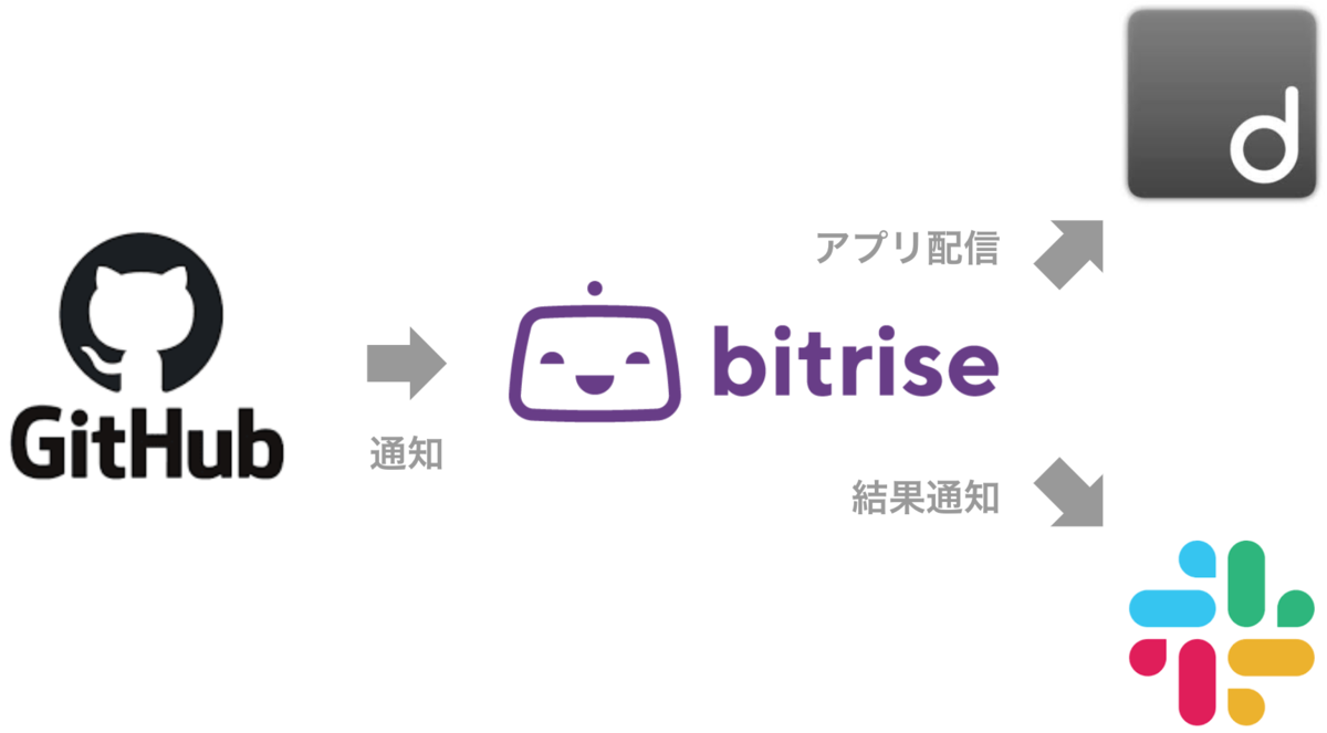 GitHubでPull Requestが作成されると、Bitrise が起動してアプリをビルド、そのアプリを DeployGate に配信して、完了したらSlackに通知します。