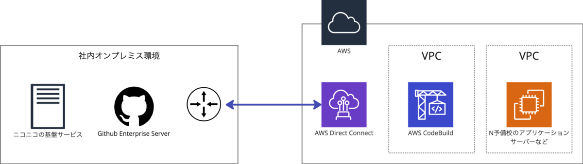 N予備校はAWS上で運用されており、GitHub Enterprise Server上でホスティングされているコードのデプロイや当時オンプレミス環境下で運用されていたニコニコの基盤サービスを利用するというニーズもあったため、オンプレミス環境との通信ではAWS Direct Connectを用いた構成となっています。