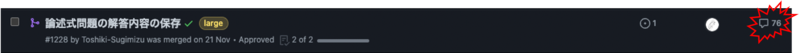 画像のようにとある PR では最終的に 76 のコメントとなりました。 一方的にこうした方が良いよというコメントではなく、自分がなぜそういう実装をしたのかを聞いてくださった上での提案をした下さることが多く、複数回にわたるキャッチボールとなり建設的な議論ができたことで、とても多くの学びを得ることができました。