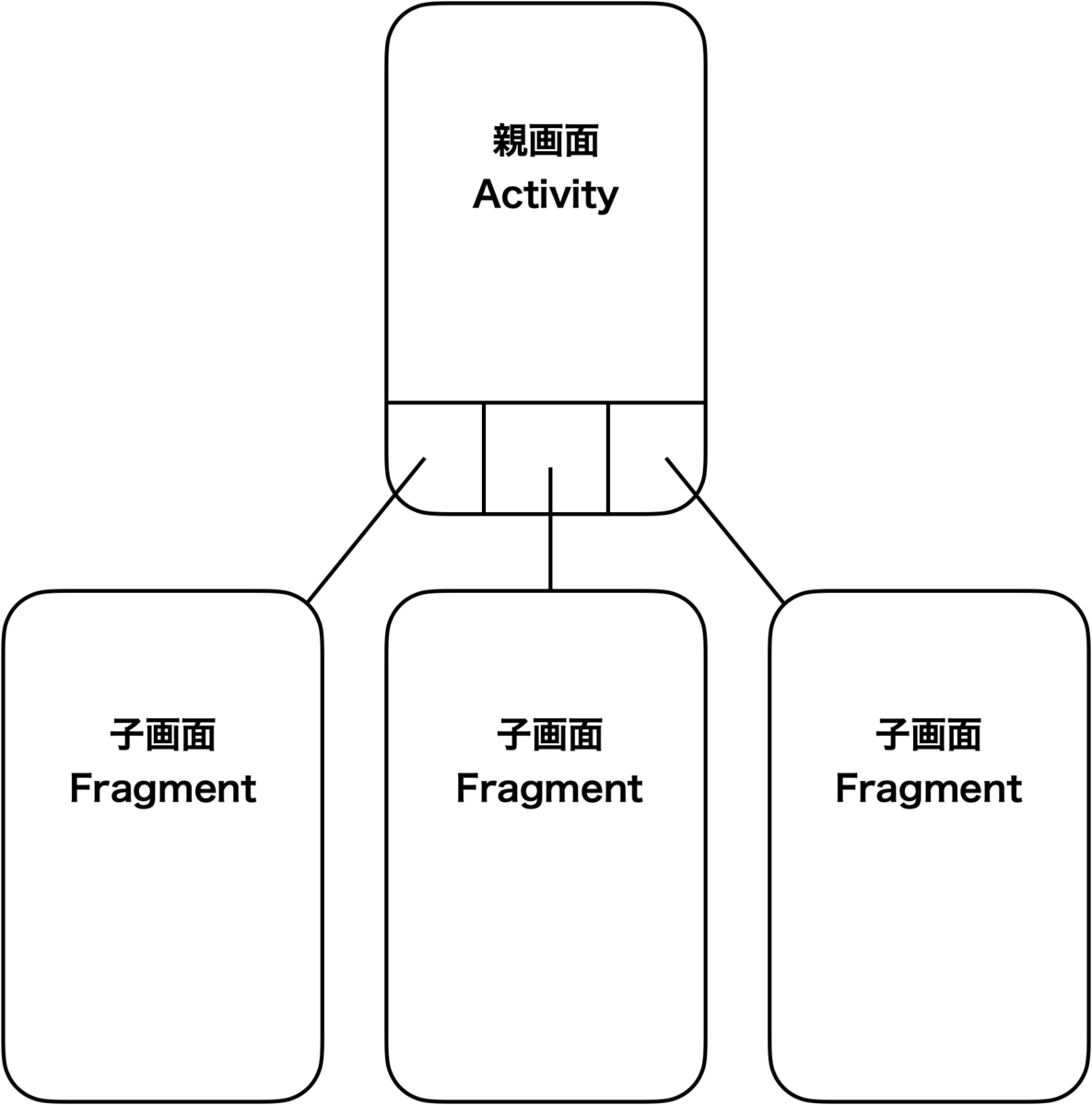 親にActivity、子にFragmentを用いる場合が多いです。例えばこのような画面構成の場合はActivityを1つ、Fragmentを3つとする構成が推奨されています。
