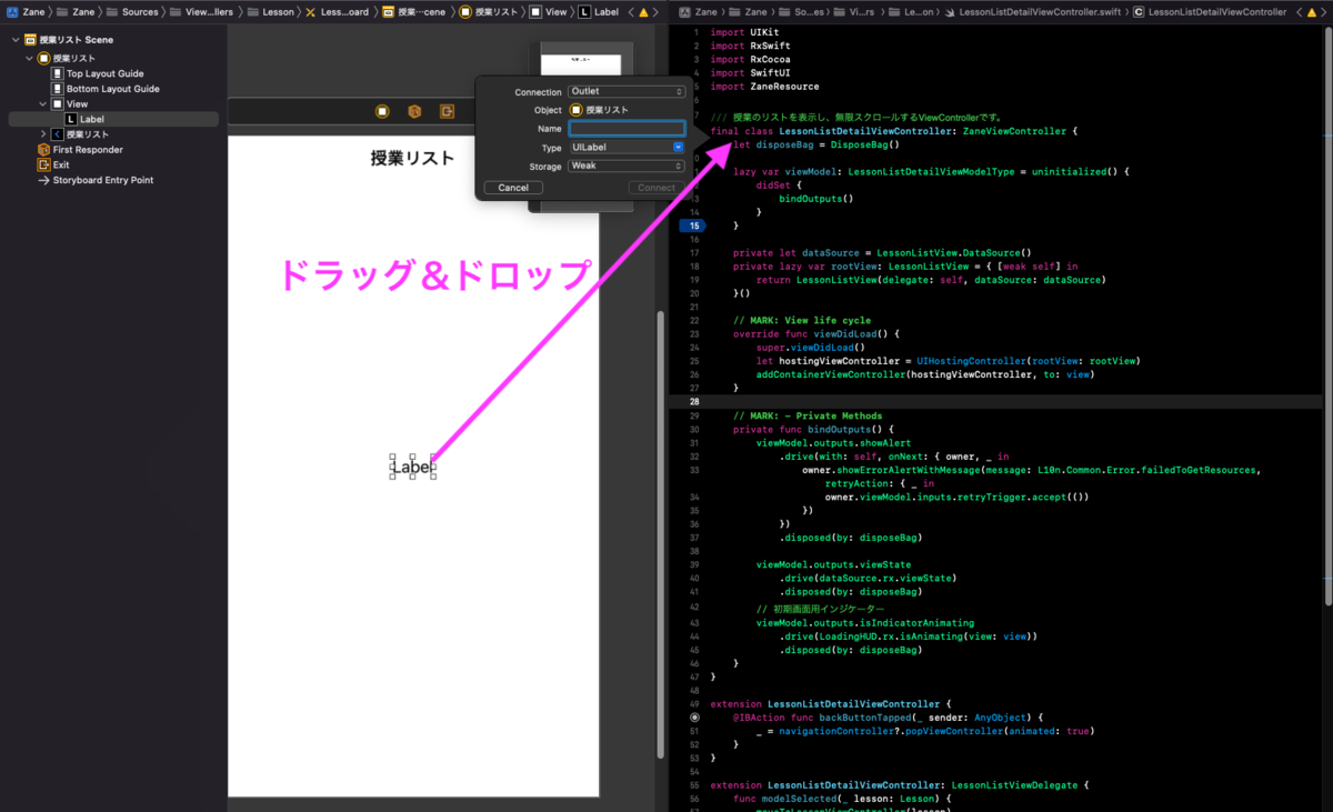 また、レイアウトとの紐付け方法ですがAndroidのBindする実装方法に慣れてしまっていたので、iOSのGUIによる視覚的な紐付け方法に驚きました。