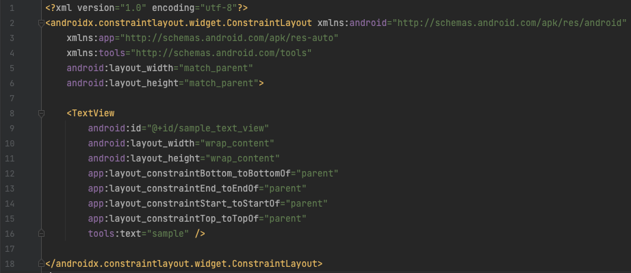<!-- sample_fragment.xml --> <?xml version="1.0" encoding="utf-8"?> <androidx.constraintlayout.widget.ConstraintLayout xmlns:android="http://schemas.android.com/apk/res/android" xmlns:app="http://schemas.android.com/apk/res-auto" android:layout_width="match_parent" android:layout_height="match_parent"> <TextView android:id="@+id/sample_text_view" android:layout_width="wrap_content" android:layout_height="wrap_content" app:layout_constraintBottom_toBottomOf="parent" app:layout_constraintEnd_toEndOf="parent" app:layout_constraintStart_toStartOf="parent" app:layout_constraintTop_toTopOf="parent" /> </androidx.constraintlayout.widget.ConstraintLayout>