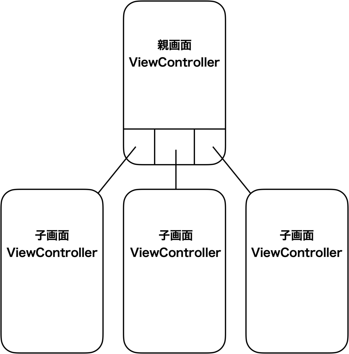 基本的に1画面に対しViewControllerを1つ作成します。例えばこのような画面構成の場合はViewControllerが4つ必要になります。